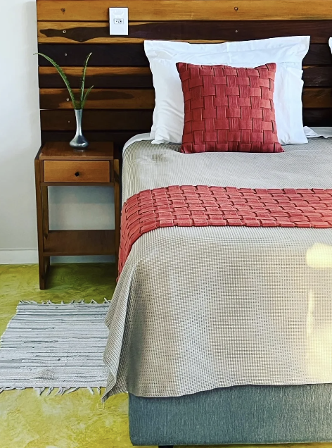 Essa suíte fica na parte externa da casa, com entrada independente e de frente para um jardim com espécies de plantas nativas do Cerrado, como canela-de-ema, araticum, gabiroba, e flores que marcam cada uma das estações do ano.